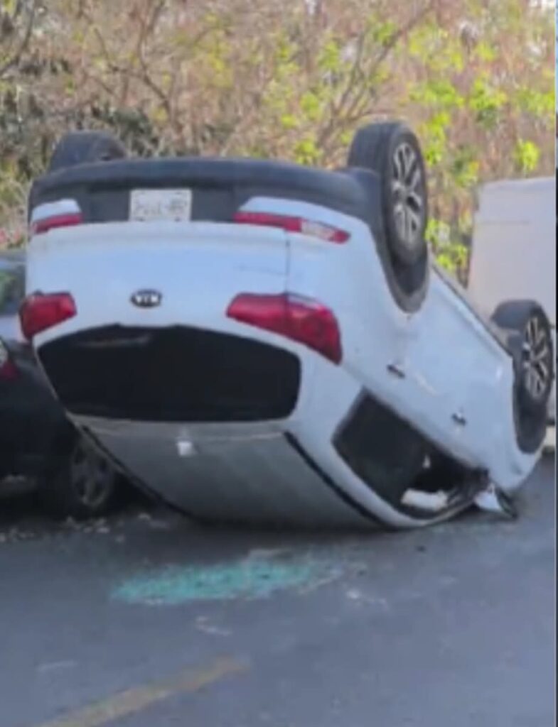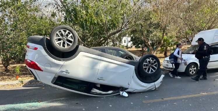 Una conductora perdió el control de su automóvil por atender el celular mientras manejaba en el fraccionamiento Pinos del Norte, ocasionando un choque entre varios autos y después terminara volcando.