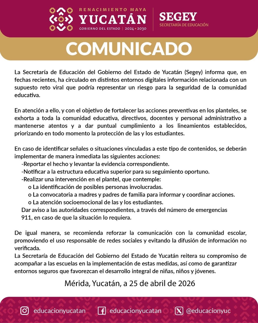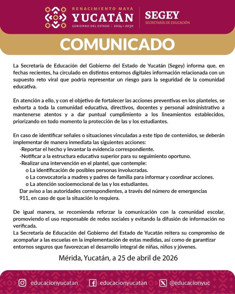 Exhortamos a la comunidad educativa a mantenerse atenta y a seguir los lineamientos establecidos, ante cualquier riesgo de seguridad, por supuestos retos virales que han estado circulando.