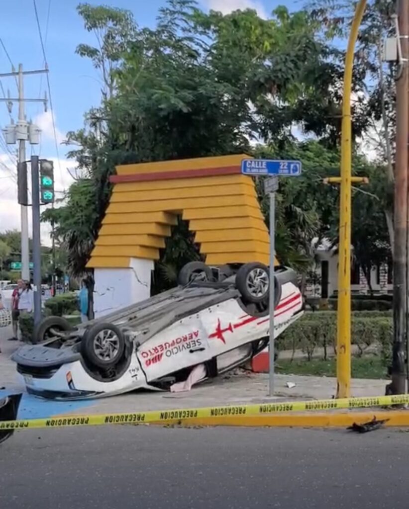 Debido al fuerte impacto, el taxi dio una vuelta y terminó volcado sobre su toldo, quedando con sus llantas para arriba.