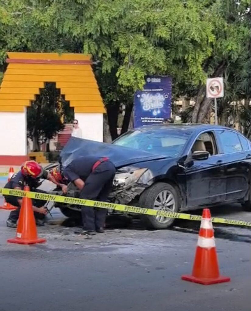 Así avanzó unos metros hasta subir la acera del parque, donde subió y se impactó contra el arco maya, el cual dejó con fisuras y a punto de caer.
