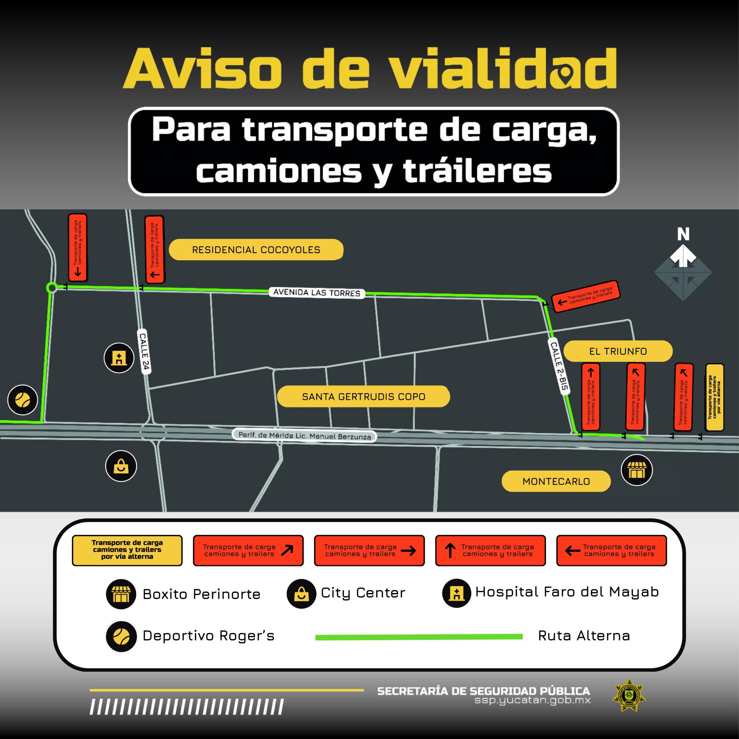La Secretaría de Seguridad Pública (SSP) informa que, debido a trabajos de infraestructura urbana en el Puente Av. García Lavín (City Center),  se implementará a partir de hoy, un desvío en el arroyo exterior hacia la lateral del km 26+500 del Periférico de Mérida, a la altura de Boxito Perinorte, para transporte de carga, camiones y tráileres.