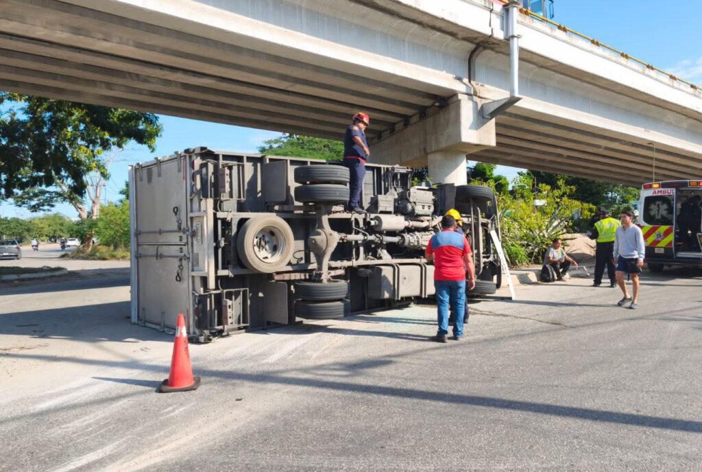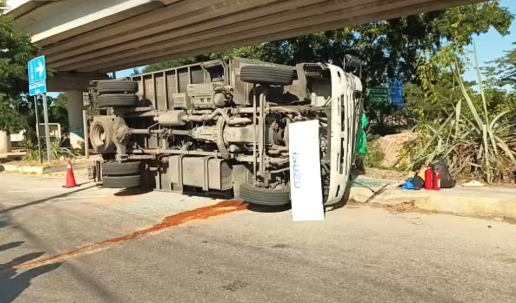 Un camión de carga volcó esta mañana al perder el control mientras se incorporaba al Periférico en Tixkokob.