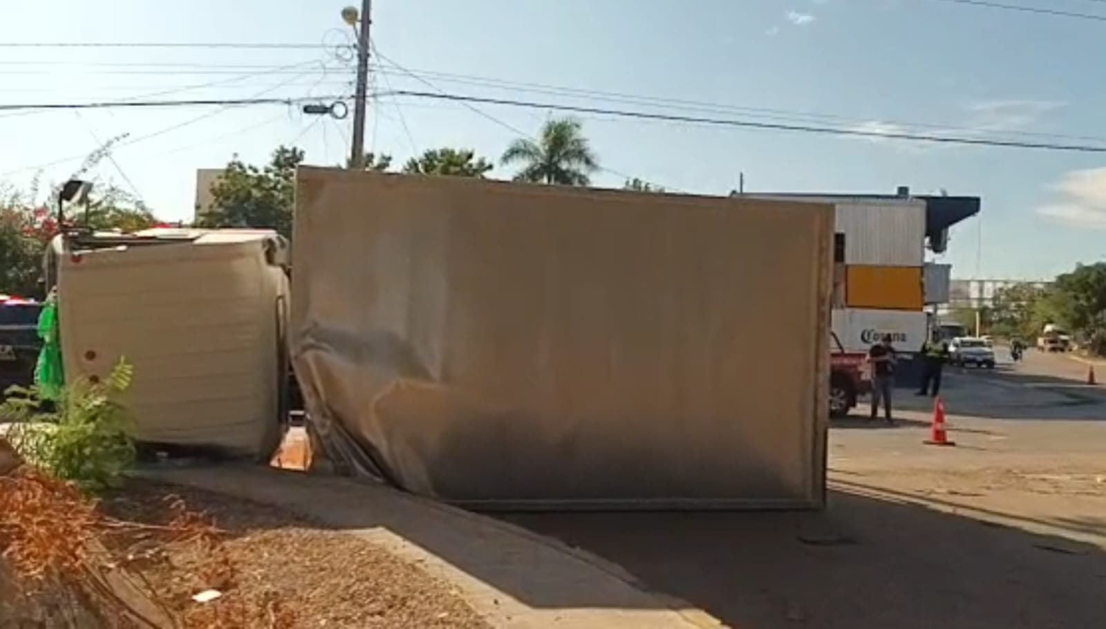Un camión de carga volcó esta mañana al perder el control mientras se incorporaba al Periférico en Tixkokob.