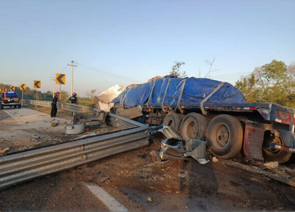 Maxcanú, Yucatán, 27 de marzo.- Dos personas resultaron lesionadas luego de que un tractocamión se impactara contra el muro de contención metálico en la carretera federal Maxcanú-Kopomá.