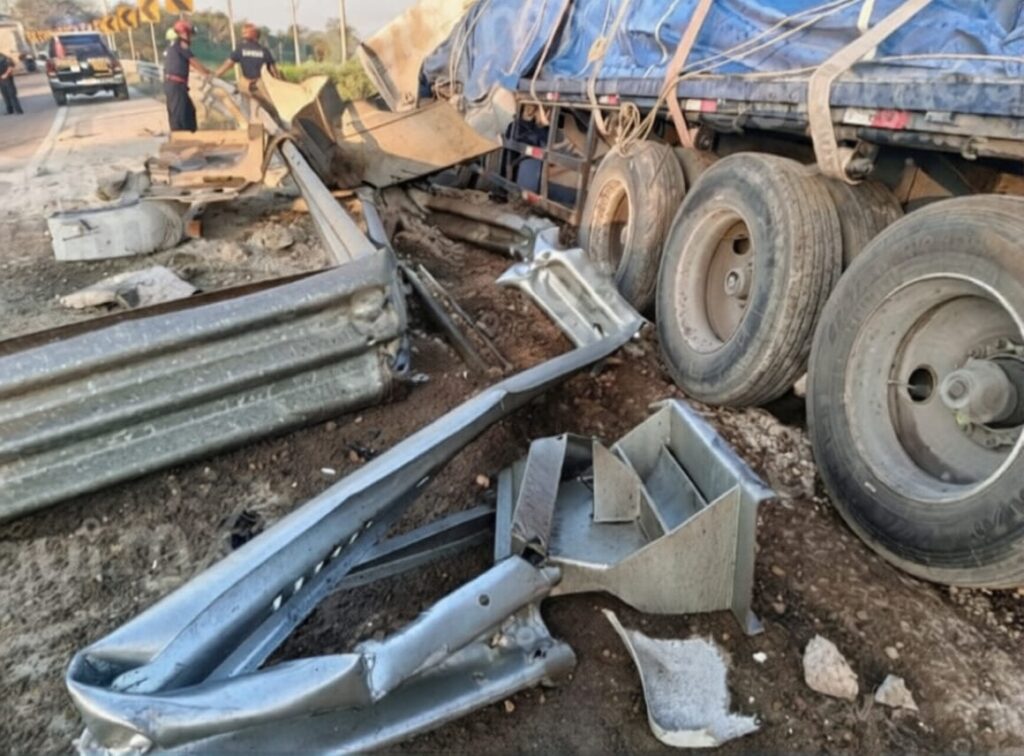 Tras el fuerte impacto, parte de la carga quedó esparcida sobre la cinta asfáltica, mientras que el vehículo terminó fuera del carril de circulación.