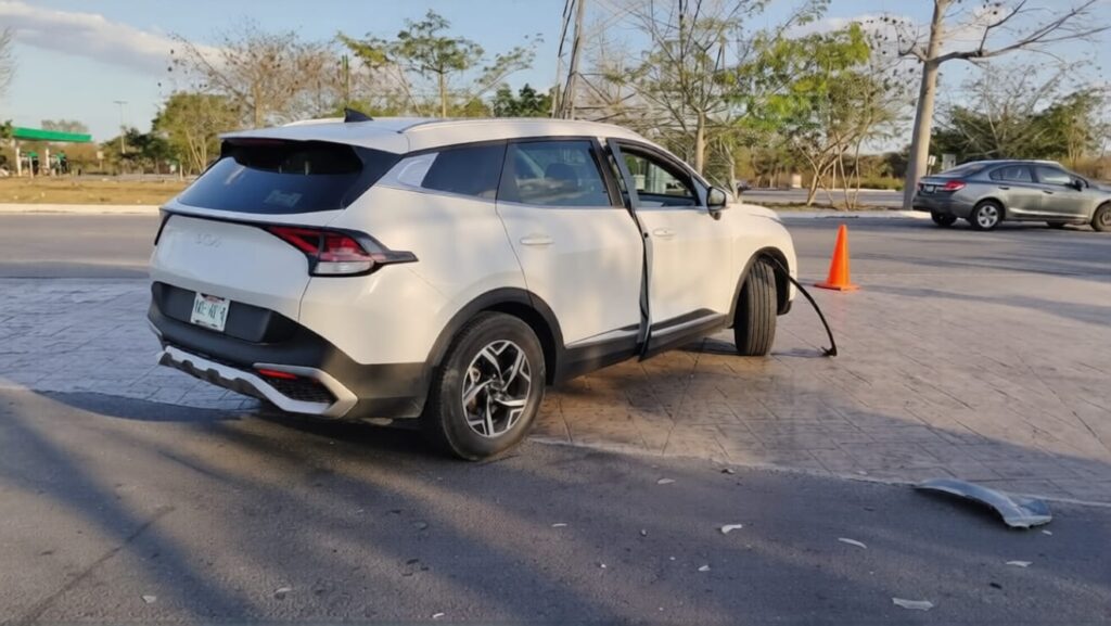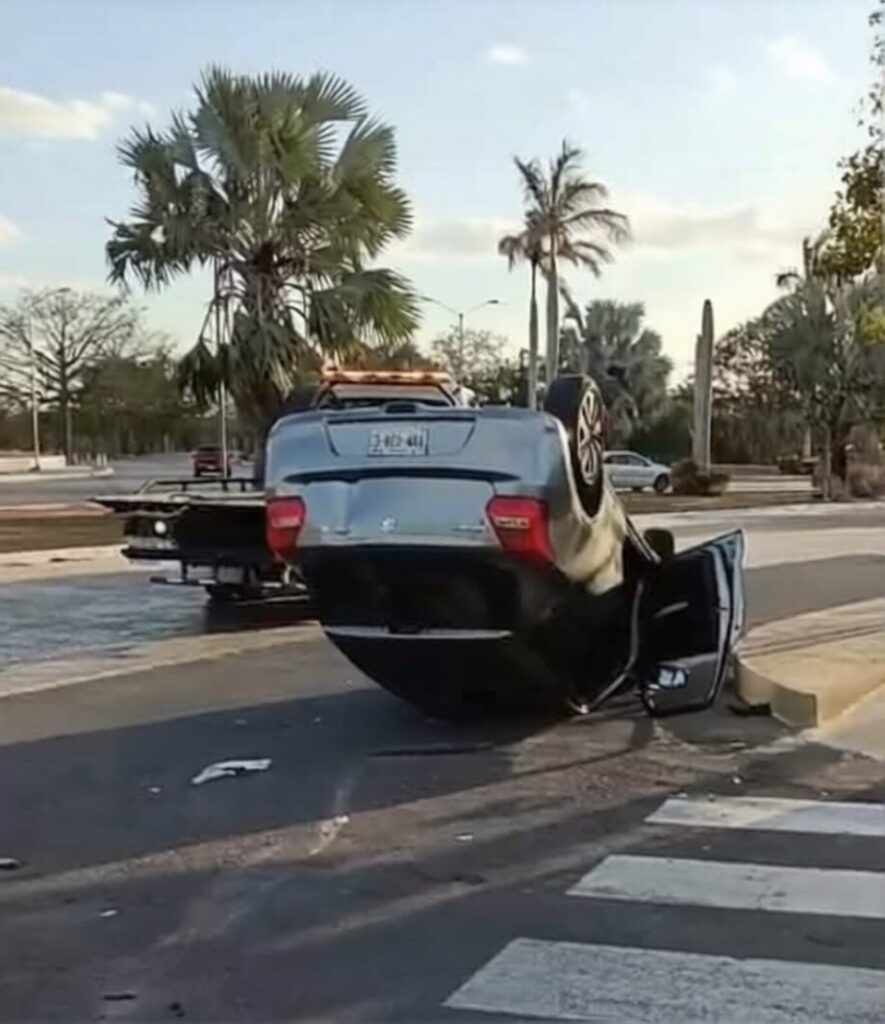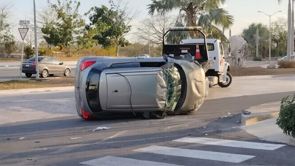 Un auto Swift quedó con las llantas hacia arriba después de chocar contra una camioneta Sportage en la calle 70 con 11-C del fraccionamiento Santa Fe Norte.