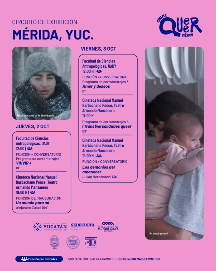 Del 2 al 5 de octubre, la Cineteca del Teatro Armando Manzanero, el Centro Cultural del Mayab y el Gran Museo del Mundo Maya, así como la Facultad de Ciencias Antropológicas de la Universidad Autónoma de Yucatán (UADY), serán sedes de proyecciones, conversatorios, además de un taller sobre la construcción de la imagen queer en la narrativa del cine.