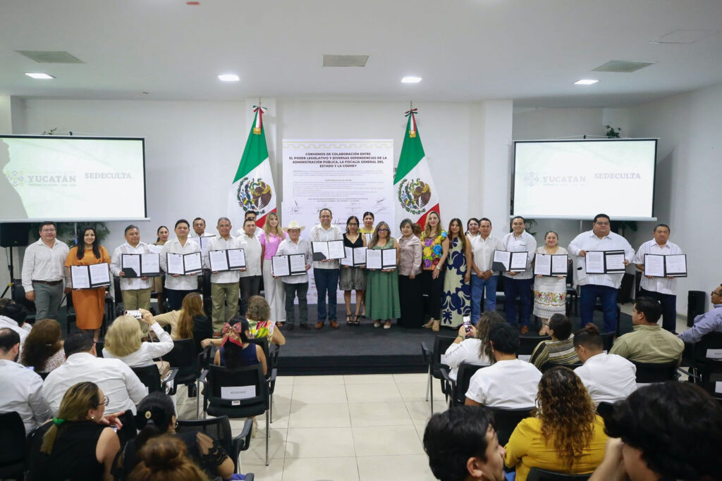 Continuando con el acto protocolario, se llevó a cabo la firma simbólica con las Secretarías: de las Mujeres, de Educación; de Ciencia, Humanidades, Tecnología e Innovación; de las Juventudes; la General de Gobierno; de la Cultura y las Artes y del Instituto para el Desarrollo de la Cultura Maya.