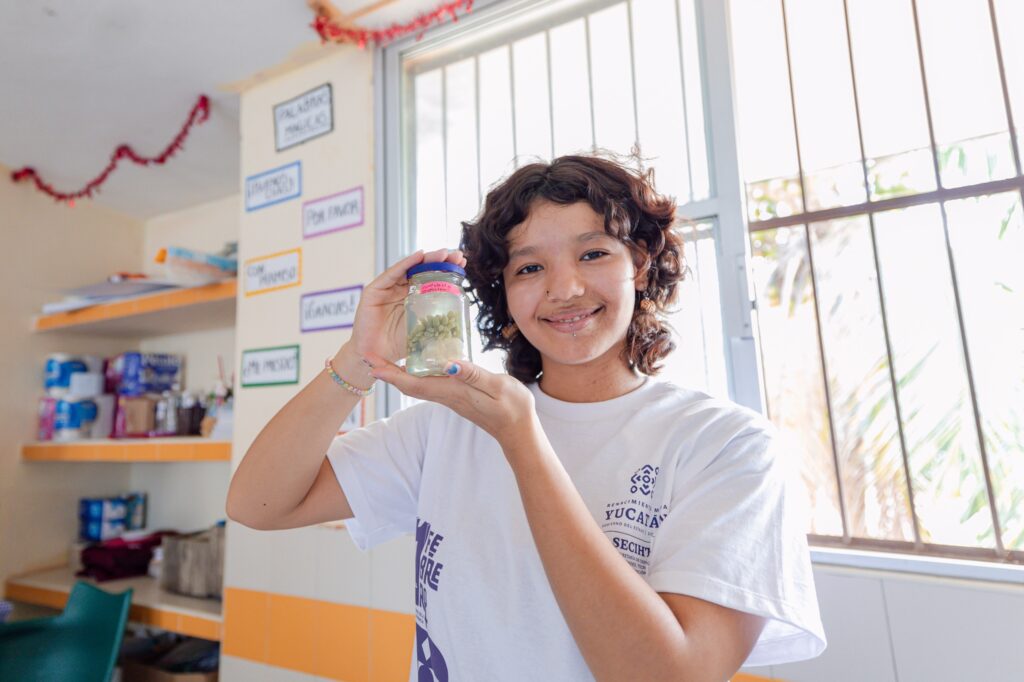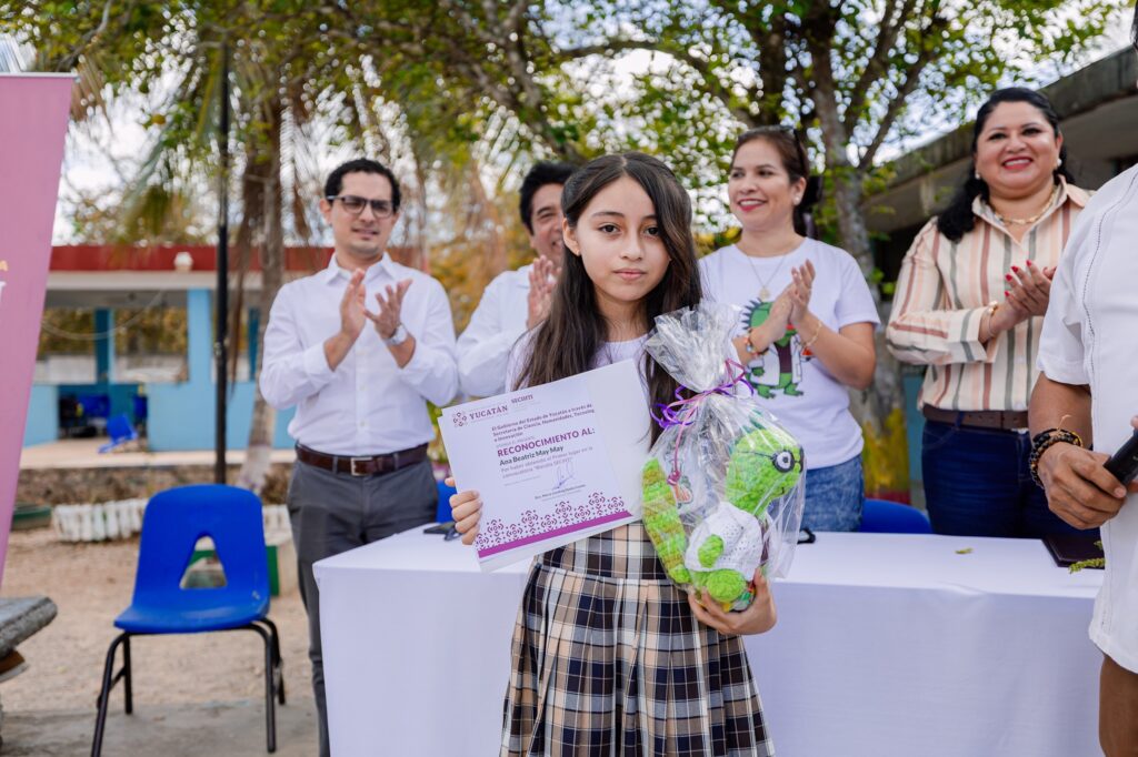 En Tixcancal también estudia la alumna Ana Beatriz May May, quien, por su talento, ganó el concurso para diseñar la botarga de la Secihti, llamada “K’awiil k’in”, un tolok científico que acompañó a la escuela durante esta jornada de aprendizaje y diversión.