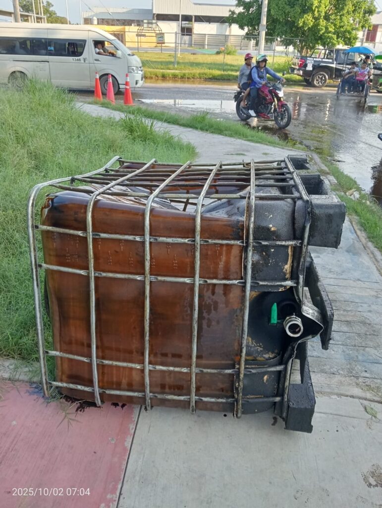 CONTENEDOR CON ACEITE QUEMADO CAE EN LAS VÍAS Y LAS DEJA RESBALOSAS