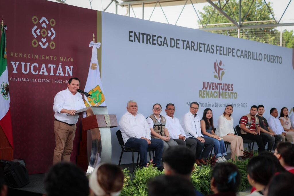 Mérida, Yucatán, a 18 de noviembre de 2025.- El Gobernador Joaquín Díaz Mena inició esta mañana la entrega de las tarjetas “Felipe Carrillo Puerto”, con las que, en una primera etapa, las y los estudiantes de la Universidad Autónoma de Yucatán (UADY) comenzarán a recibir un apoyo económico de tres mil pesos bimestrales, a fin de que puedan continuar sus estudios y lograr sus objetivos académicos.