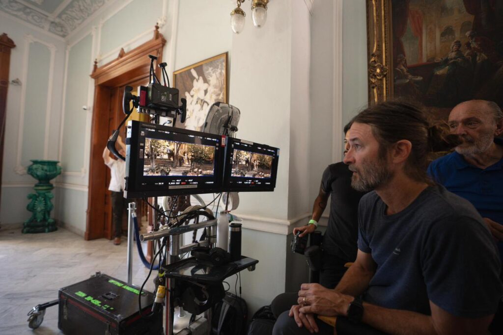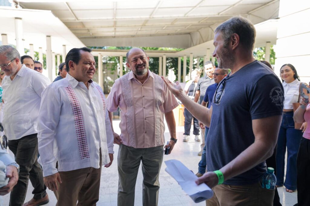 La comitiva fue recibida por el equipo de producción, ante quienes el Gobernador, acompañado por el secretario de Turismo, Darío Flota Ocampo, sostuvo una conversación detallada sobre el avance de la película y las condiciones de trabajo en las locaciones yucatecas, destacando el profesionalismo del equipo y el potencial del estado para futuras producciones.