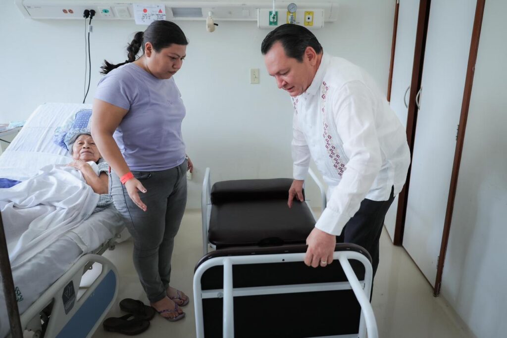 Durante el recorrido, el titular del Ejecutivo estatal platicó con Yolanda Cua Chalé, quien acompaña a su madre, Perpetua Chalé y Chim, durante su recuperación tras una cirugía de hernia, y reconoció la mejoría que representan estas sillas cama para los familiares que pasan las noches en vela al cuidado de sus pacientes.