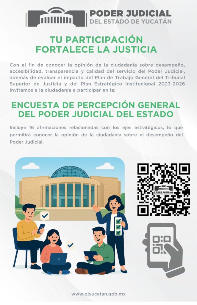 El Poder Judicial del Estado de Yucatán destacó que los resultados de esta consulta servirán para tomar decisiones que contribuyan a reorganizar y redirigir los esfuerzos institucionales. Por ello, la participación ciudadana en este ejercicio es fundamental.