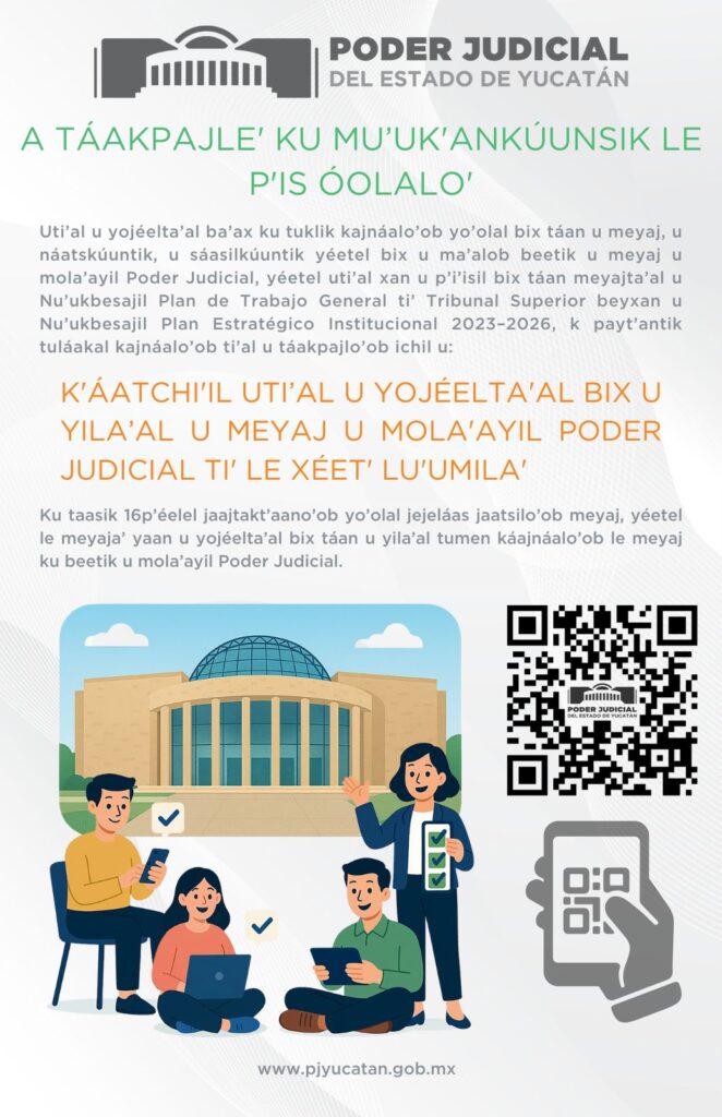 La encuesta puede responderse a través de la liga digital https://www.pjyucatan.gob.mx/encuesta/?i=m o mediante un código QR. Además, cuenta con una versión en lengua maya, disponible en https://www.pjyucatan.gob.mx/encuesta/?i=e, con el propósito de escuchar la voz de la población maya hablante de la entidad. La consulta permanecerá abierta hasta el 15 de noviembre.