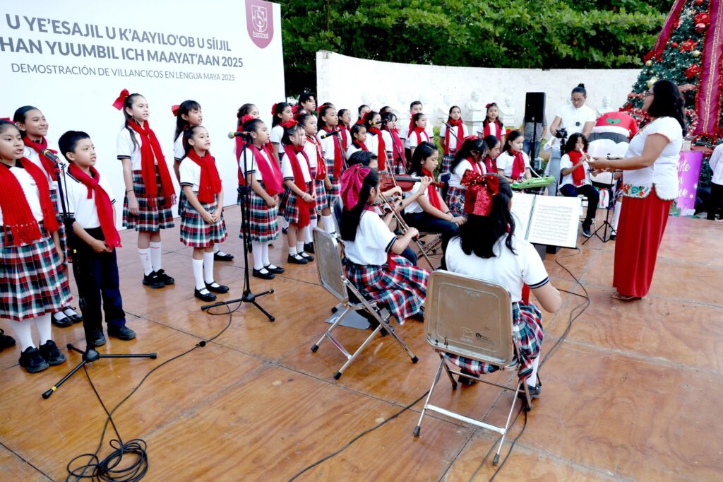 Alumnas y alumnos de educación indígena y del programa Ko’one’ex Kanik Maaya interpretaron villancicos en lengua maya en la explanada de la Segey.
