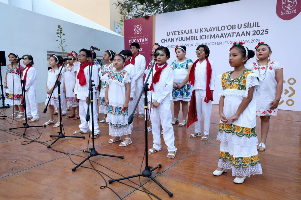 Mérida, Yucatán, a 19 de diciembre de 2025.- El canto de niñas y niños en lengua materna se hizo presente en la explanada de la Secretaría de Educación del Gobierno del Estado de Yucatán (Segey), donde las y los estudiantes de los niveles Inicial, Preescolar y Primaria de Educación Indígena, así como del programa Ko’one’ex Kanik Maaya (Vamos a aprender maya), protagonizaron una emotiva demostración de villancicos en lengua maya, que llenó el recinto de orgullo, identidad y espíritu navideño.