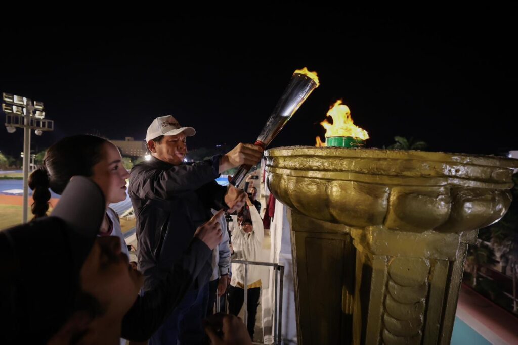 Posteriormente, Díaz Mena encabezó el encendido del pebetero olímpico junto con el custodio del Ritual del Aniversario del Estadio General “Salvador Alvarado”, Yohjanzen Leonel Macías Medina, y se realizaron 87 vueltas en la pista de tartán, así como en la alberca olímpica.
