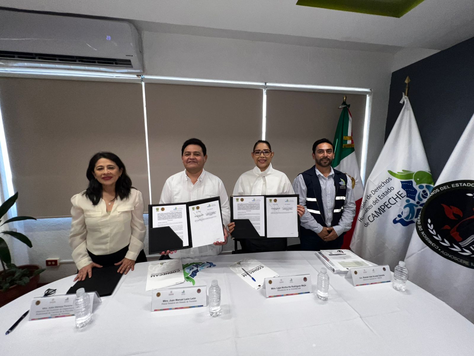 Atestiguaron la firma del convenio, Román Iván Acosta Estrella, director del Instituto de Estudios en Derechos Humanos de Campeche y Adda Marissa Peniche Novelo, directora del Instituto de Capacitación y Servicio Profesional de Carrera de la FGE.