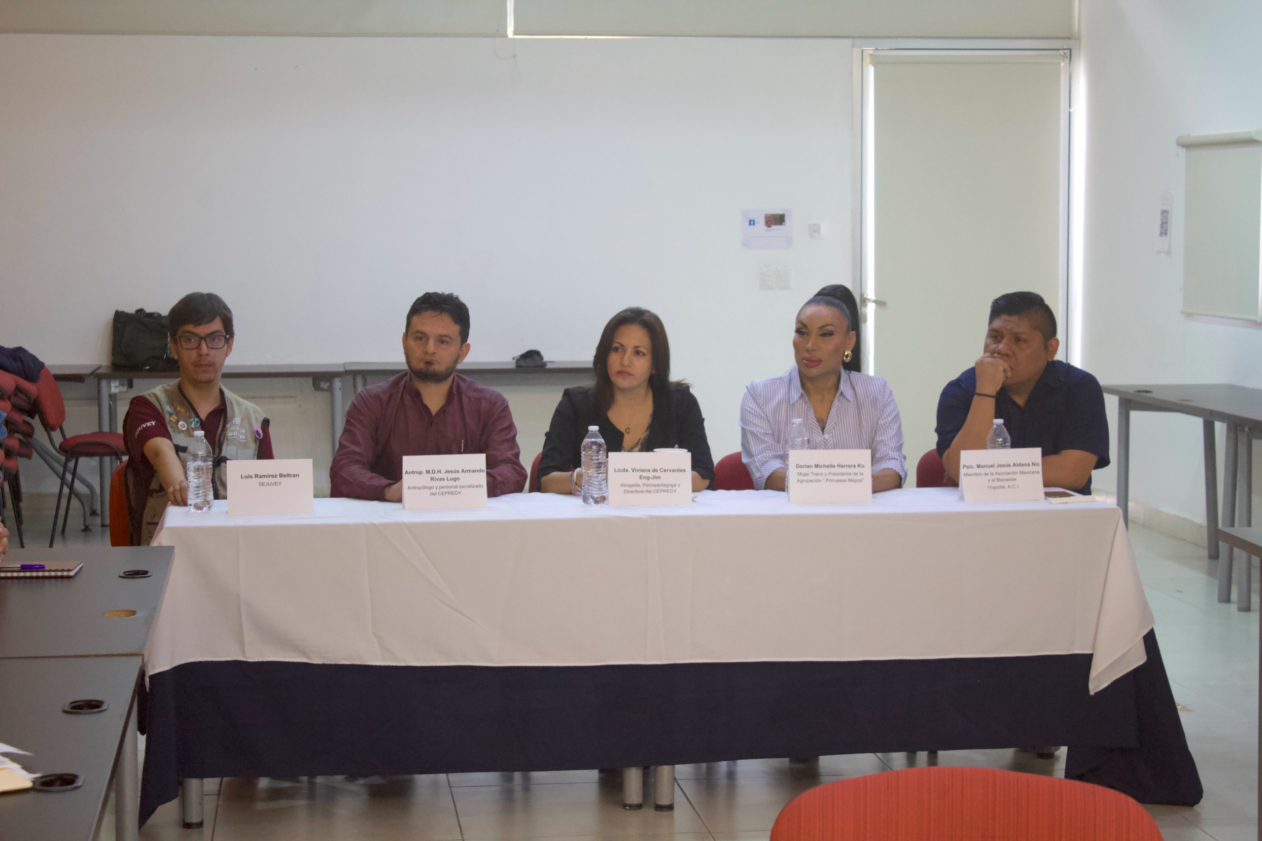 Para garantizar una visión integral, multidisciplinaria y humana, el foro contó con la participación de un panel de especialistas de la sociedad civil y del ámbito gubernamental, entre quienes se encontraron la presidenta de la Agrupación Princesas Mayas, Dorian Michelle Herrera Ku; el coordinador de Planeación del Cepredy, Jesús Armando Rivas Lugo; la directora del Cepredy, Vivianne De Cervantes Eng-Jim; y el representante de la Asociación Civil Yaxché, Manuel Aldana Nic.