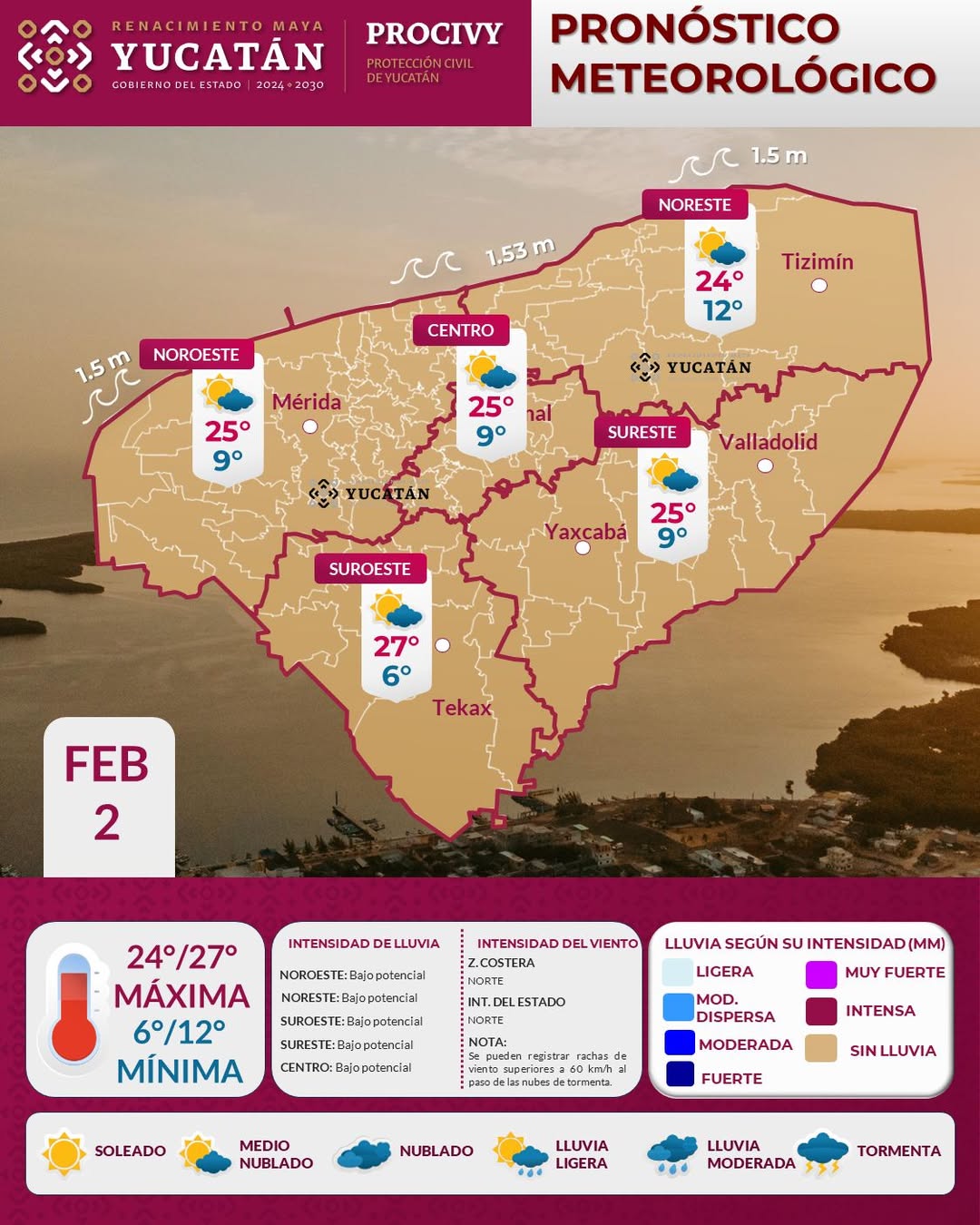 Para este lunes 2 de febrero, continuarán los efectos de la masa de aire ártico que predomina en la región, favoreciendo tiempo estable sobre el estado de Yucatán, ambiente templado en el día y muy frío al amanecer.