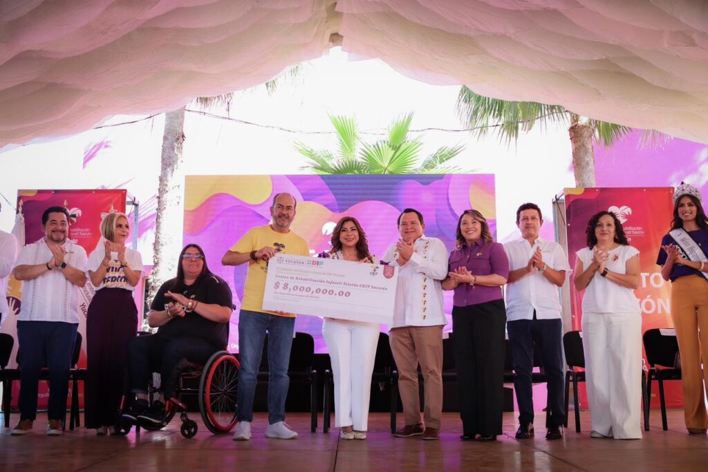 Durante el evento Teletón 2025, el Gobernador Joaquín Díaz Mena, junto a la Presidenta honoraria del DIF Yucatán, Mtra. Wendy Méndez Naal, entregó un donativo de ocho millones de pesos para fortalecer la atención en el CRIT Yucatán, reafirmando su compromiso de construir un estado más incluyente y de promover la igualdad de oportunidades y el bienestar de las familias que reciben atención en rehabilitación e inclusión social.