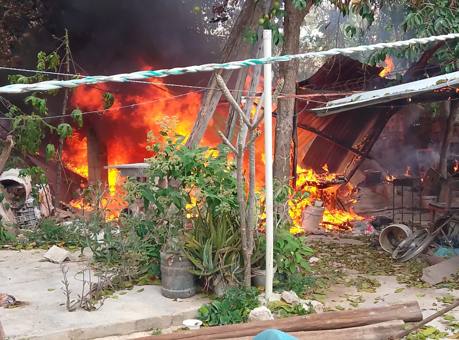 Una cocina de cartón y láminas fue consumida por las llamas causadas por una chispa de una estufa de leña cuando guisaban la comida en una vivienda de la colonia Dzibikal en Umán, Yucatán.
