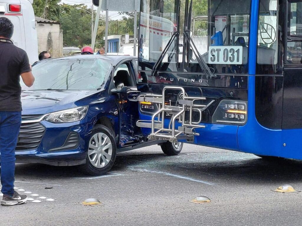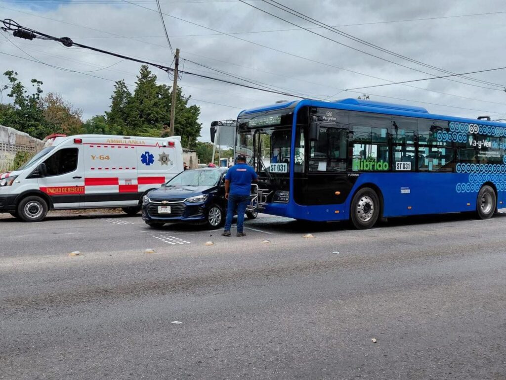 Un choque entre una unidad del Va y Ven y un vehículo particular ocurrió en el puente de Tixkokob cuando la conductora del vehículo particular intentó hacer un retorno en U en zona prohibida, por lo que fue impactada por el camión.