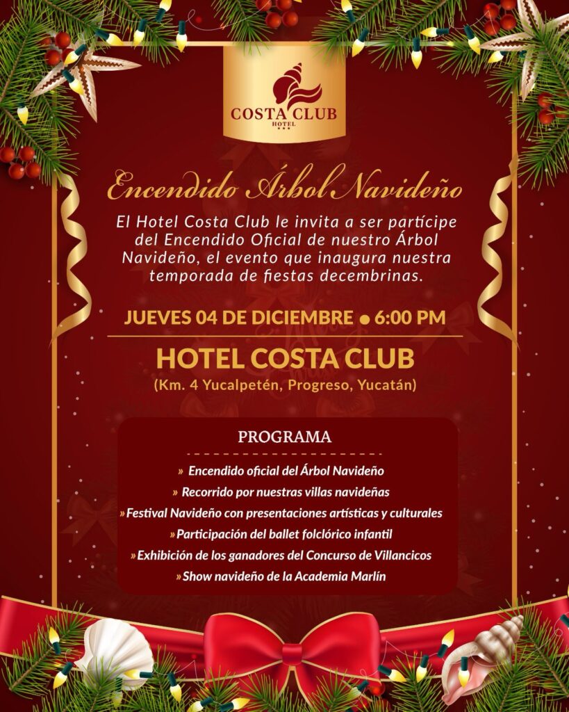 Progreso, Yucatán, a 30 de noviembre de 2025.- Para fortalecer la convivencia familiar y preservar las tradiciones decembrinas, el Instituto de Seguridad Social para los Trabajadores del Estado de Yucatán (Isstey), a través de su Centro Vacacional – Hotel Costa Club, realizará el encendido oficial del Árbol Navideño, en un espacio emblemático que forma parte del patrimonio de las y los trabajadores yucatecos al servicio del Estado.