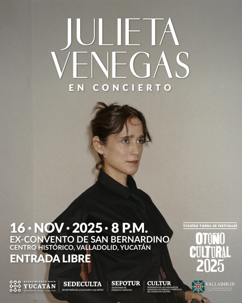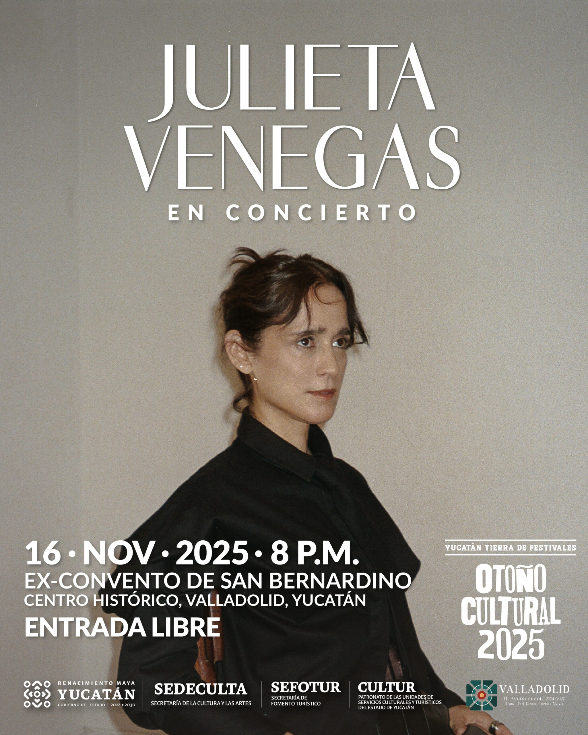 Mérida, Yucatán, a 14 de noviembre de 2025.- En el marco del Otoño Cultural, la Sedeculta, Sefotur, Patronato Cultur y el Ayuntamiento de Vallaolid ofrecen un concierto completamente gratuito con Julieta Venegas en el Atrio del Convento de San Bernardino de Siena, en Valladolid, este 16 próximo a las 20:00 horas.