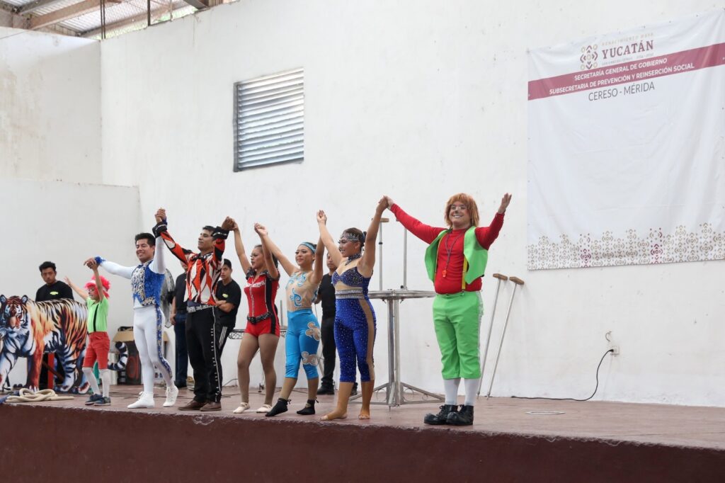 Mérida, Yucatán, a 15 de diciembre de 2025.- La magia del circo llegó a las personas privadas de la libertad en el Centro de Reinserción Social (Cereso) de Mérida, como parte de las actividades orientadas a fortalecer su acceso a la cultura y la convivencia familiar.