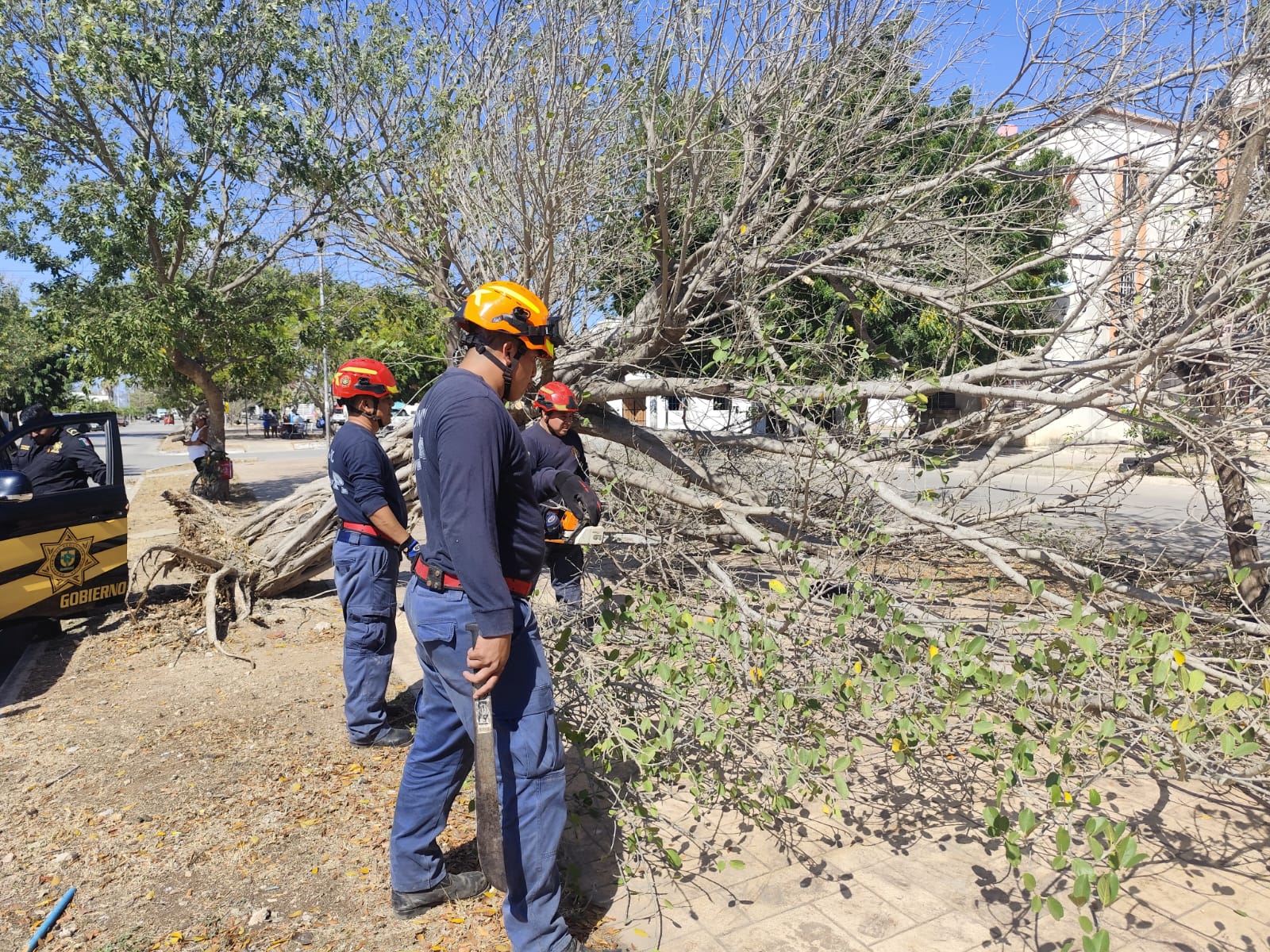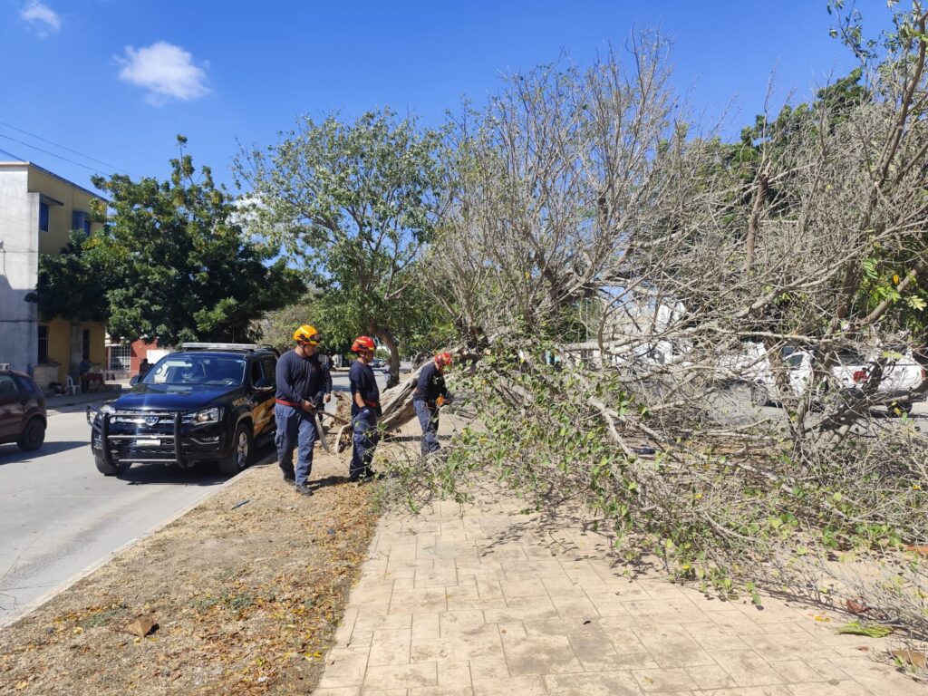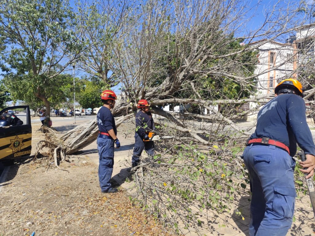 Un hombre resultó lesionado al caerle encima un árbol seco en el fraccionamiento Piedra de Agua, Umán.
