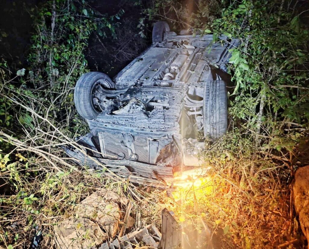El automóvil involucrado en el accidente terminó volcado dentro de la maleza y sus ocupantes resultaron lesionados, siendo trasladados a una clínica de la zona para recibir atención médica.