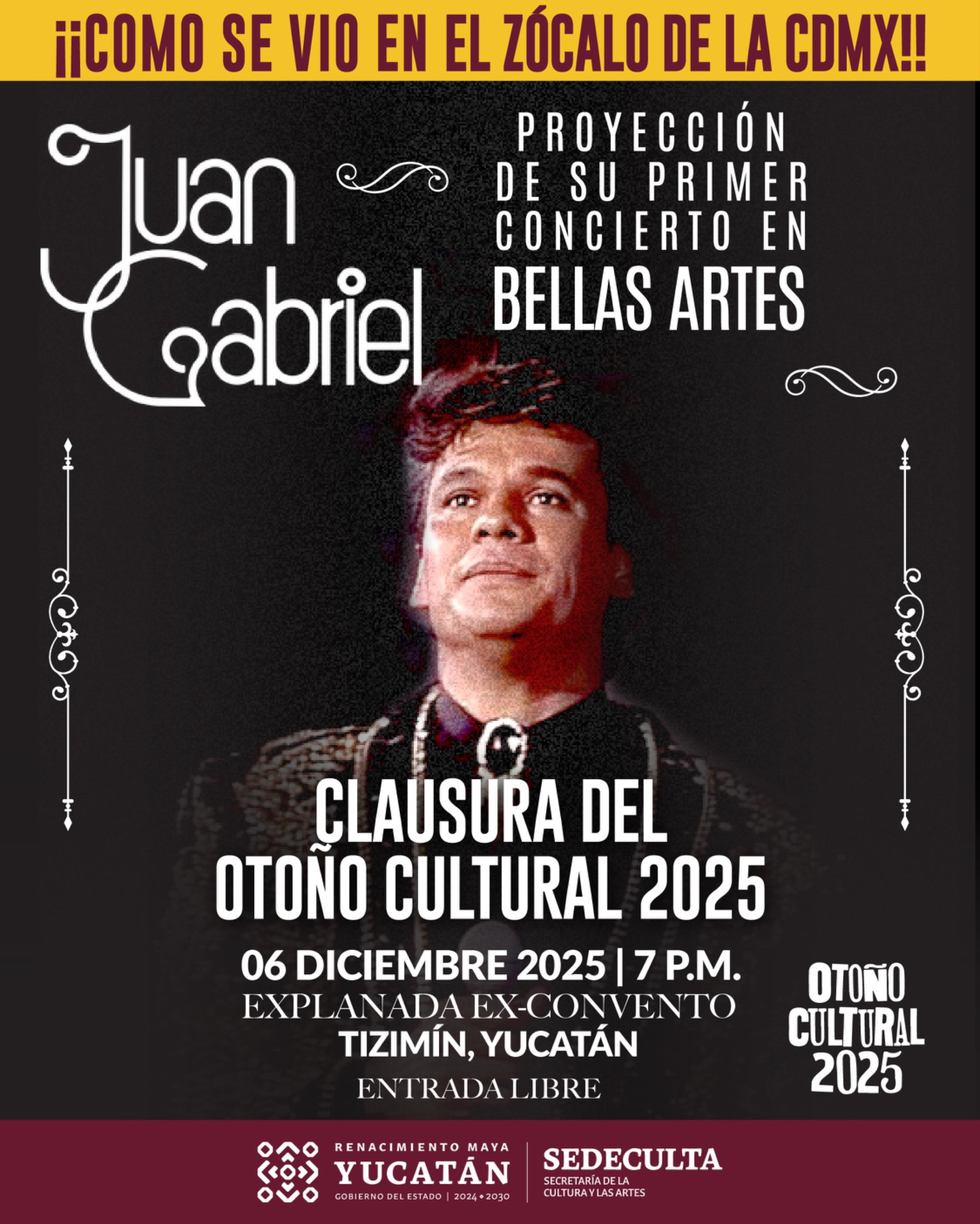 Esta presentación promete una noche memorable con una de las actuaciones más recordadas de Juan Gabriel, mediante una proyección de entrada libre que reafirma el compromiso del Gobierno del Estado, a través de la Sedeculta, de descentralizar los eventos artísticos y culturales para el disfrute de la población más allá de la capital yucateca.