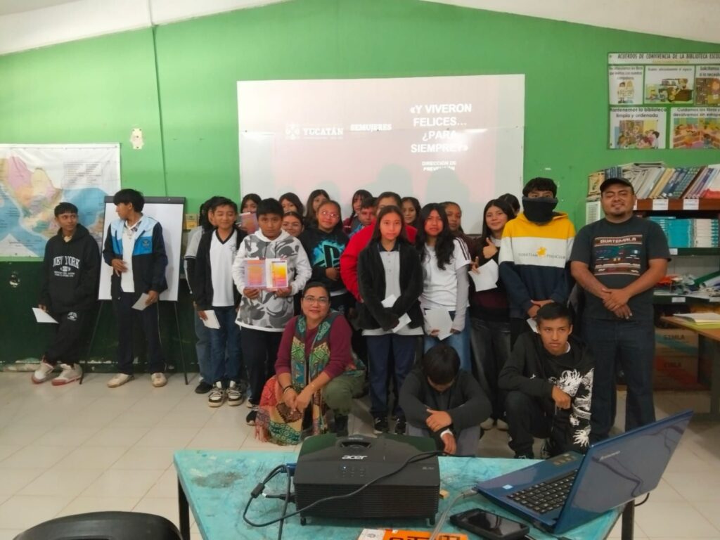 Mérida, Yucatán, a 23 de noviembre de 2025.- Como parte de la estrategia nacional por una vida libre de violencia para mujeres, niñas y adolescentes, personal de la Secretaría de las Mujeres (Semujeres) impartió talleres de sensibilización sobre “Los mitos del amor romántico” y “Prevención de la violencia” en comunidades de Yaxcabá y Hunucmá.