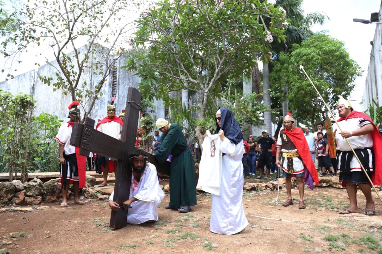 Más adelante, el contingente atravesó los jardines con rumbo al campo deportivo, espacio que sirvió como escenario para la crucifixión. Tras avanzar unos metros más, las y los participantes llegaron al sitio donde fue colocada la cruz.