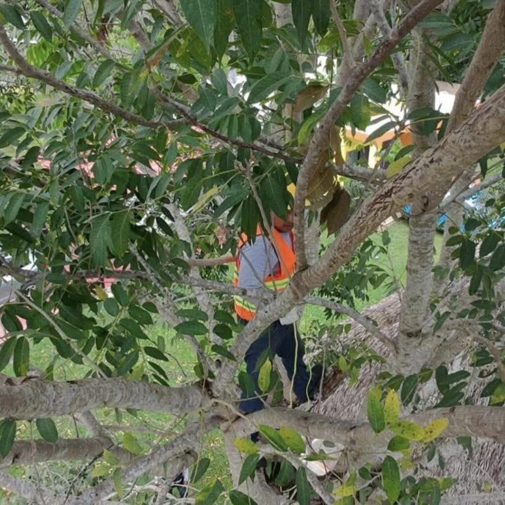 Elementos de Protección Civil de Tizimín rescataron a un gato llamado “Pancho” que se había subido a un árbol y no podía bajar.