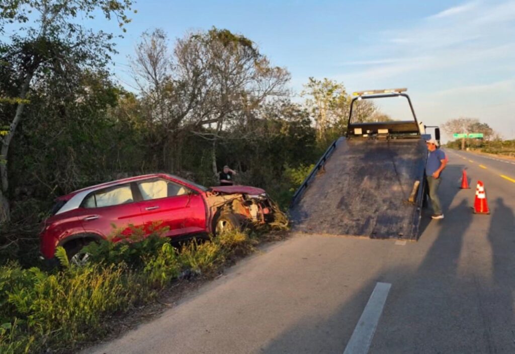 Buctzotz, Yucatán.– 22 de abril.– Un aparatoso incidente vial se registró en el kilómetro 109 de la carretera federal Mérida–Tizimín, en el tramo entre Sucilá y Buctzotz, donde un conductor de origen extranjero perdió el control de su vehículo y terminó fuera de la vía.