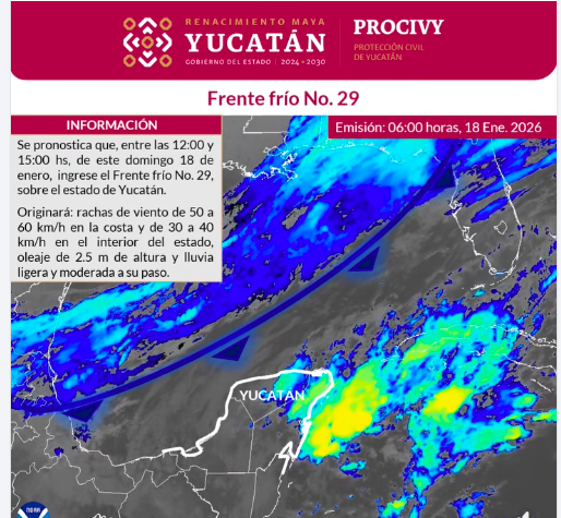 Se espera que, entre las 12:00 y 15:00 horas de este domingo 18 de enero, ingrese el Frente Frío No. 29, sobre el estado de Yucatán.