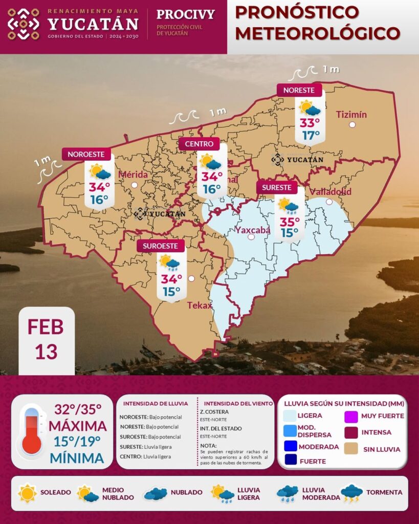 Para este viernes 13 de febrero, aunque la influencia de un sistema de alta presión favorece tiempo estable sobre la Península de Yucatán, el ingreso de humedad proveniente del Mar Caribe, y el calentamiento diurno, favorecen la presencia de lluvia ligera aislada en algunas regiones del oriente de la península.