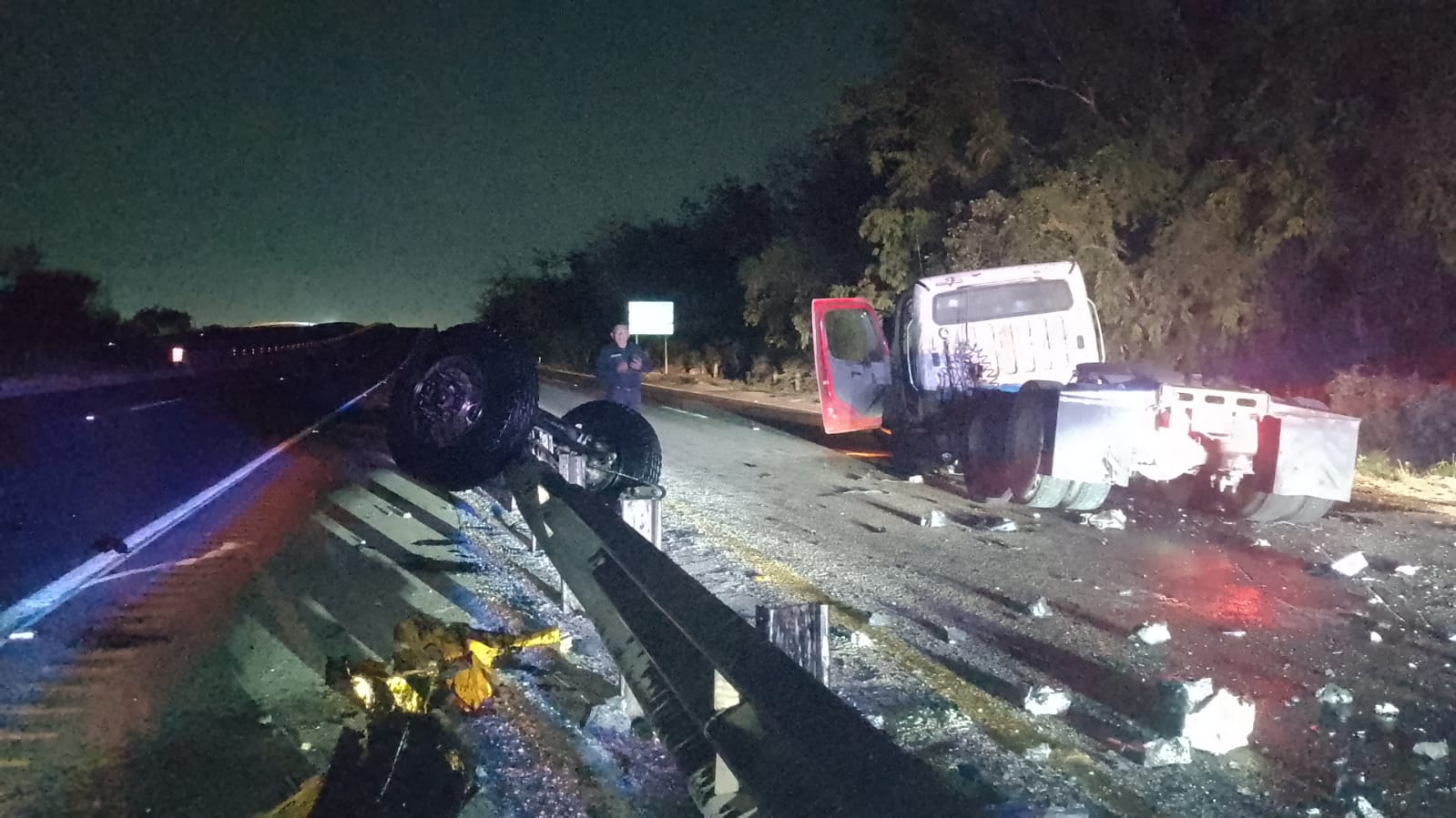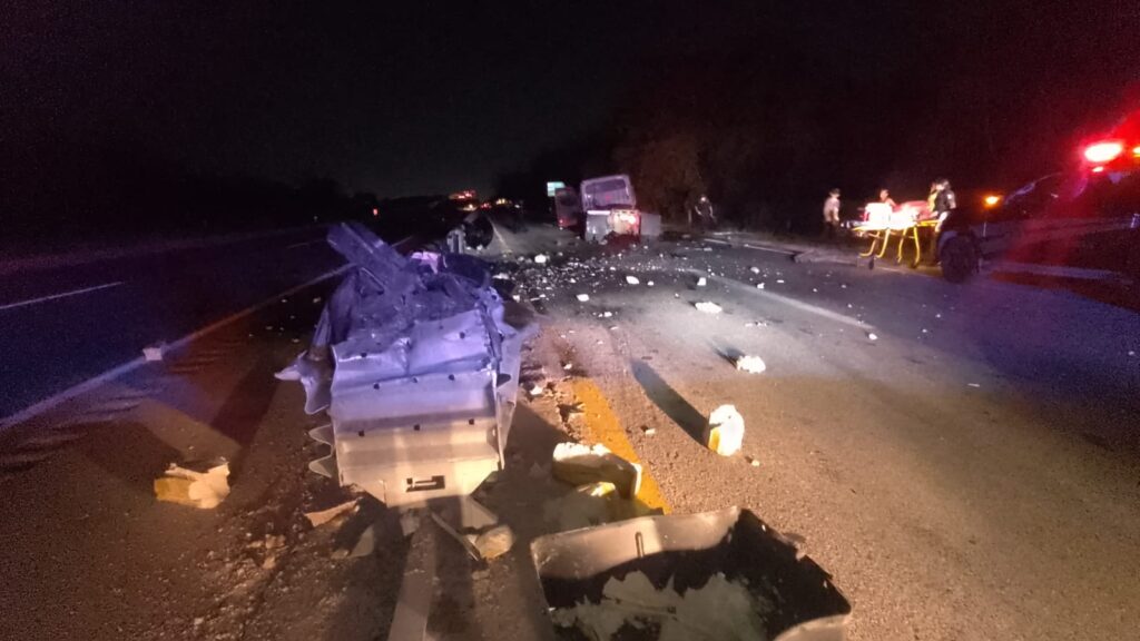 Aparatoso accidente se registró la noche del martes en la carretera Campeche–Mérida, luego de que un tractocamión se impactara contra un muro de contención y su conductor se diera a la fuga.