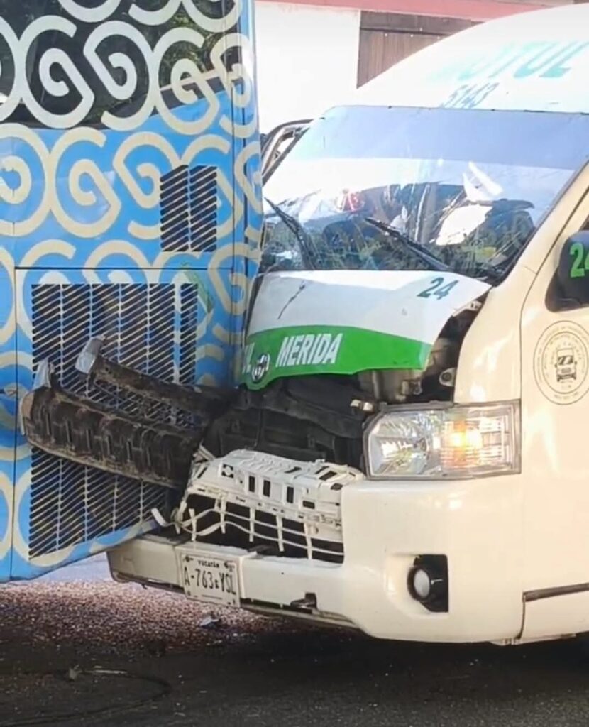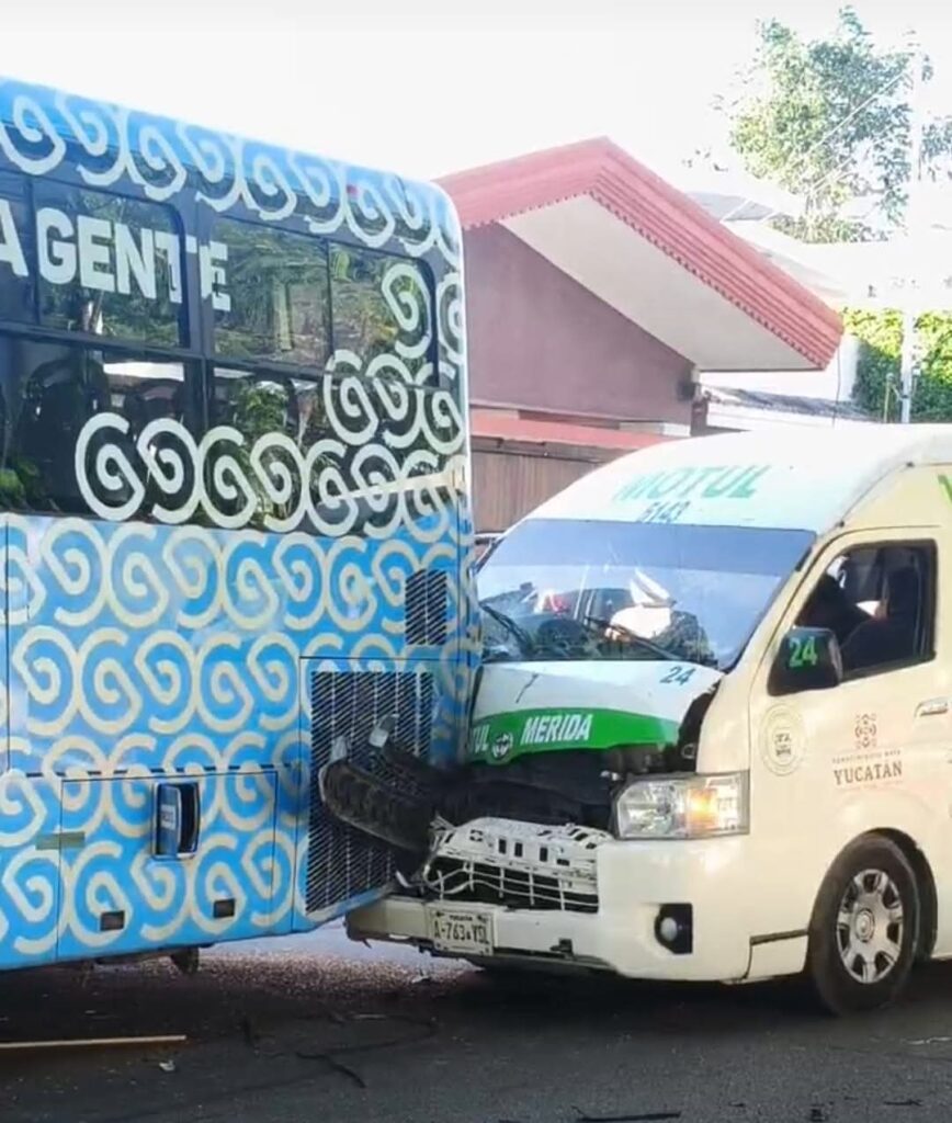Un fuerte impacto entre una combi de pasajeros de la ruta Mérida-Motul y un Va y Ven ruta Alemán-Universidades se registró esta mañana en la Avenida Yucatán, cerca de los Arcos.
