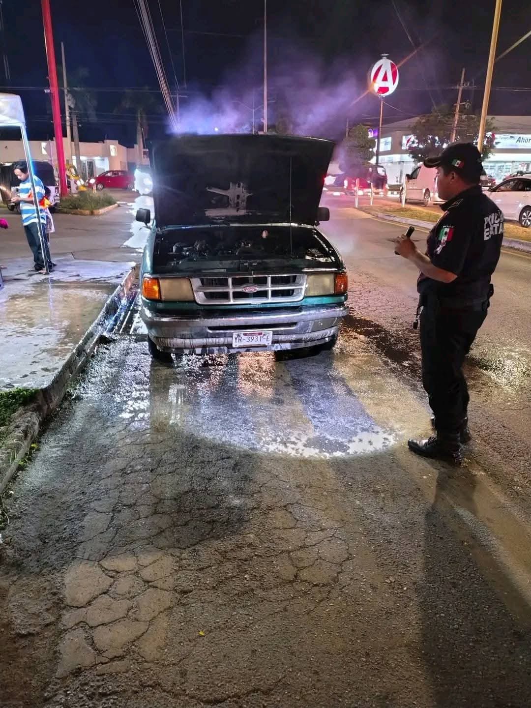 Un comerciante evitó que una camioneta Ford Ranger fuera consumida por las llamas luego de que un presunto cortocircuito provocara el incendio en la colonia Juan Pablo II, sobre la avenida 41 por 22.