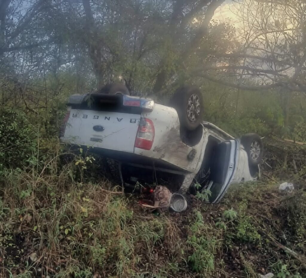 El vehículo, una Ford Ranger con placas del Estado de México, quedó abandonado tras salirse hacia su costado derecho y volcar.