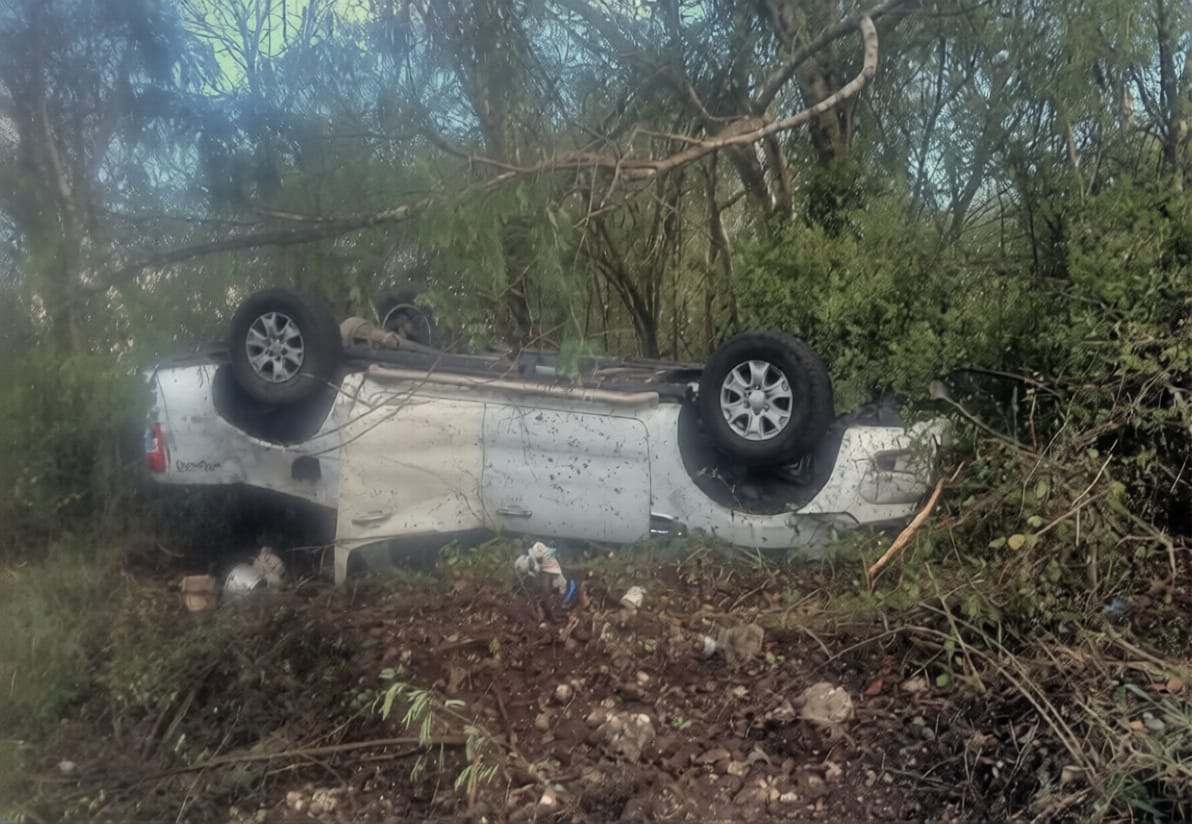 Mérida, Yucatán.– Una camioneta terminó volcada sobre su toldo en el kilómetro 1 de la carretera Dzununcán–Xcucul Sur, luego de que el conductor perdiera el control y se diera a la fuga.